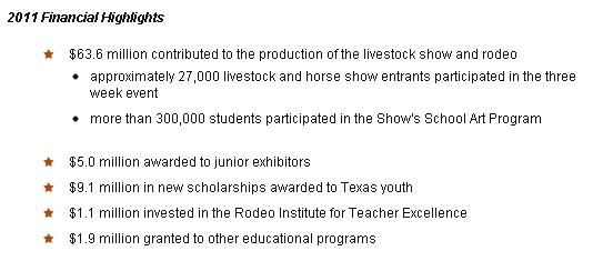 Every year from late February through March, The HLSR brings in millions of dollars and gives it back to students, teachers and the surrounding communities. In 2011 along, over $9 million dollars was award to Texas students in the form of college scholarships.